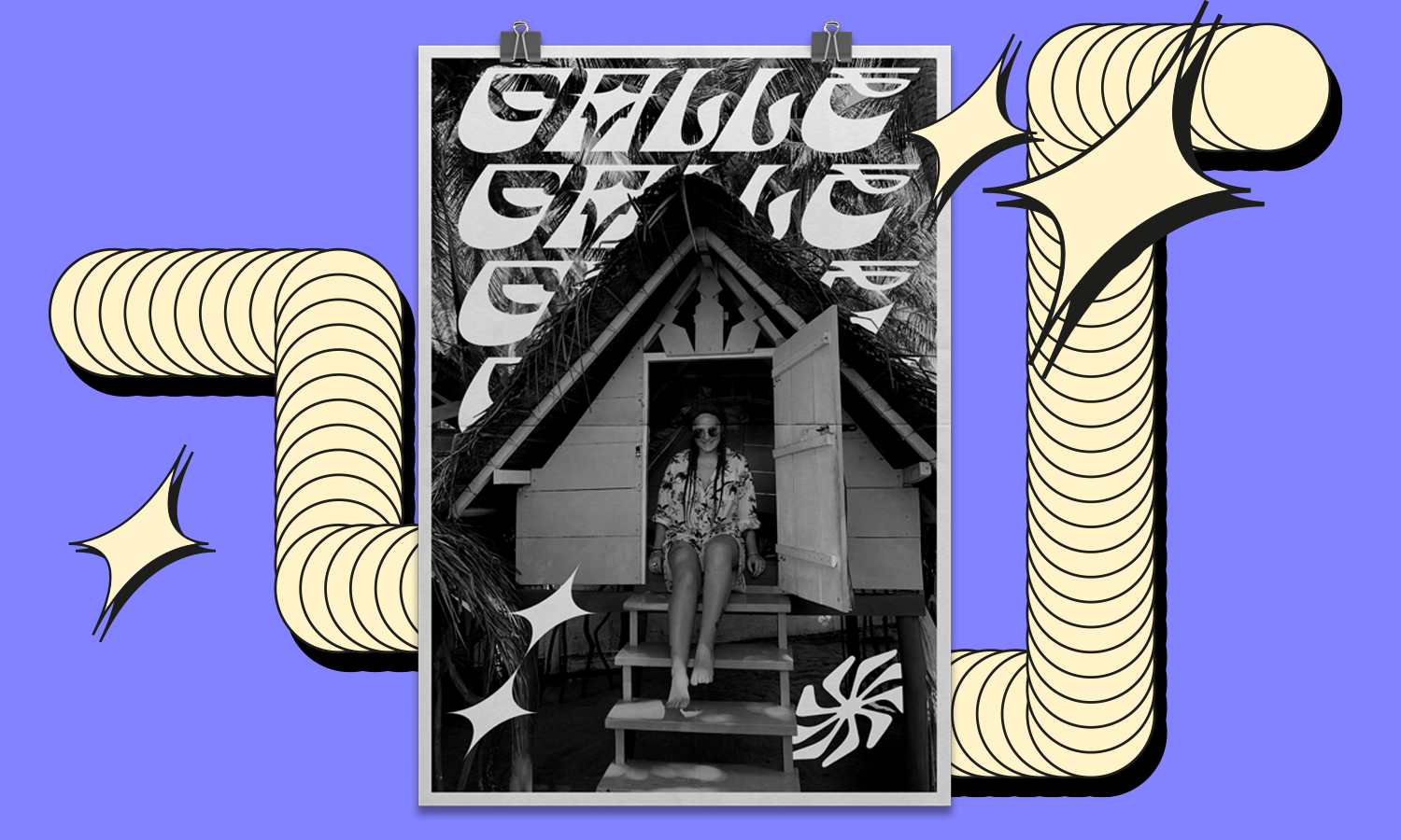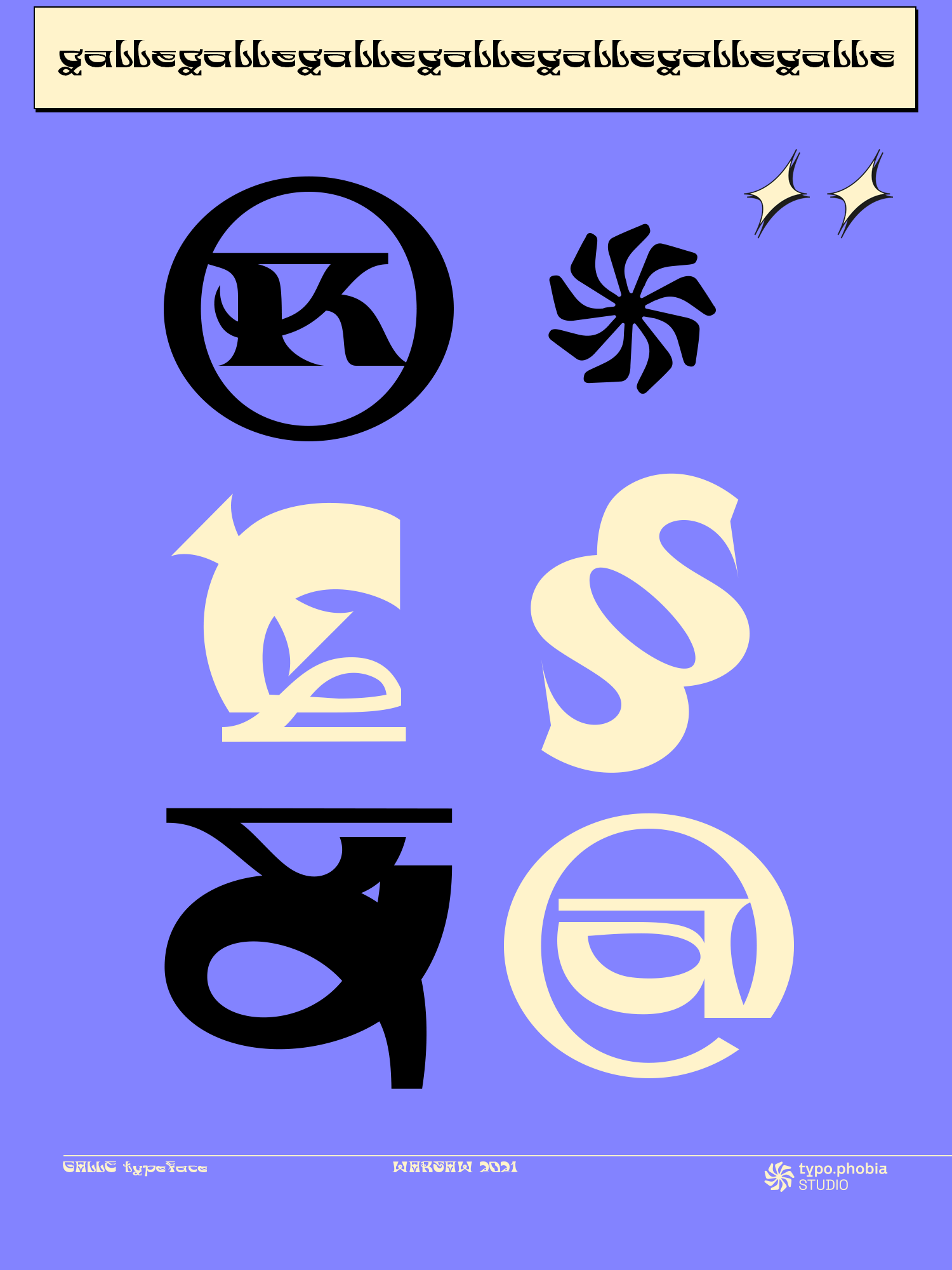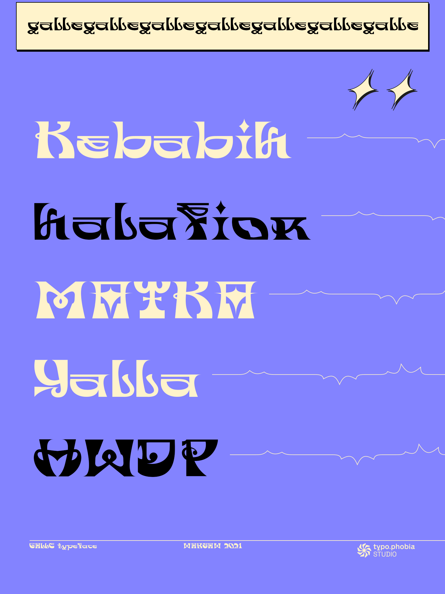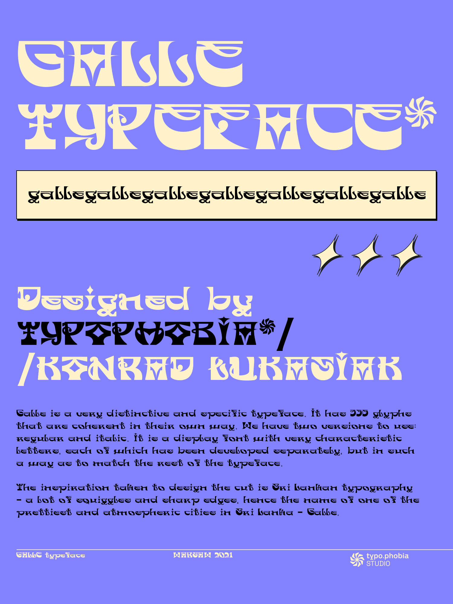 Galle is a very distinctive and specific typeface. It has 356 glyphs that are coherent in their own way. We have two versions to use: regular and italic. It is a display font with very characteristic letters, each of which has been developed separately, but in such a way as to match the rest of the typeface. The inspiration taken to design the cut is Sri Lankan typography - a lot of squiggles and sharp edges, hence the name of one of the prettiest and atmospheric cities in Sri Lanka - Galle.